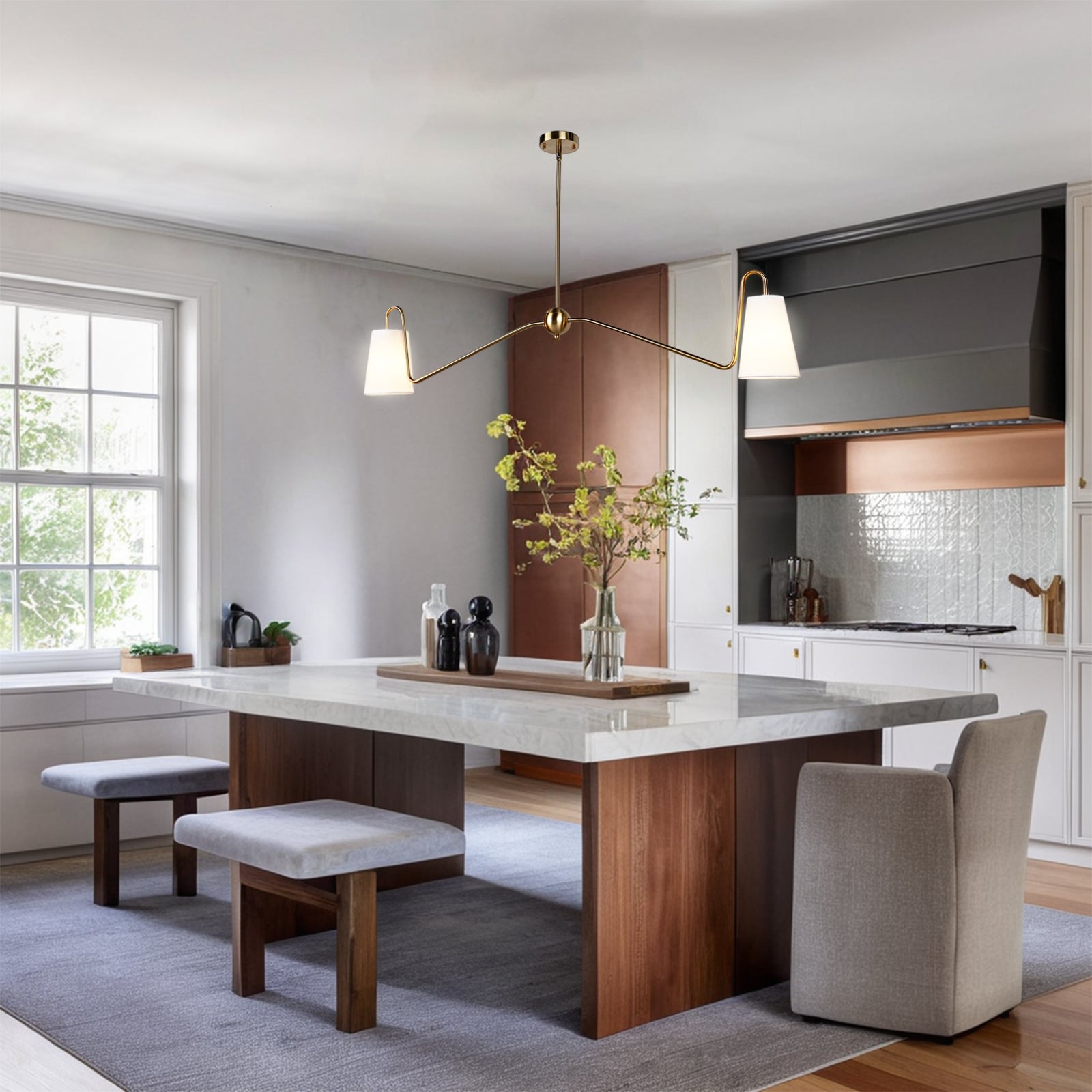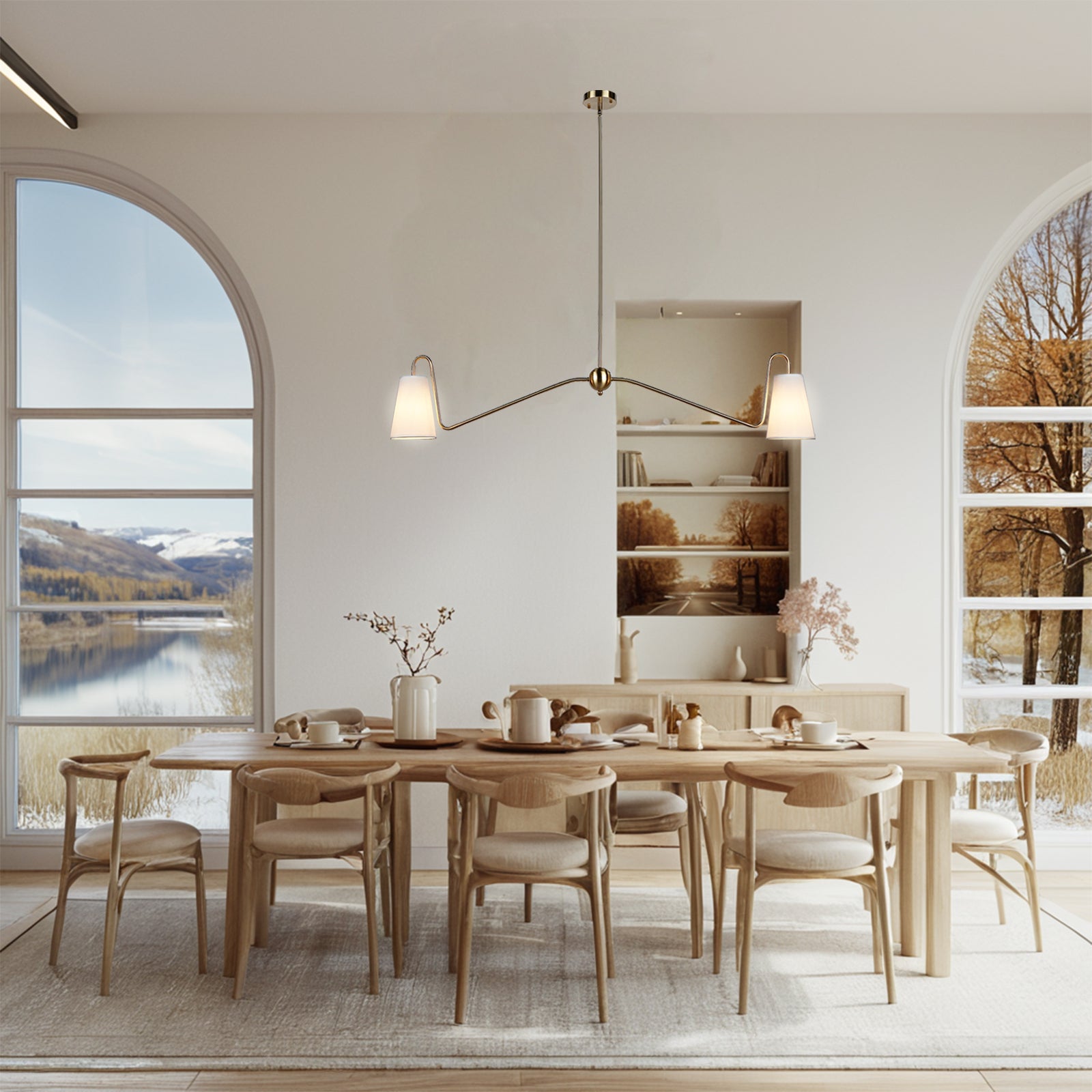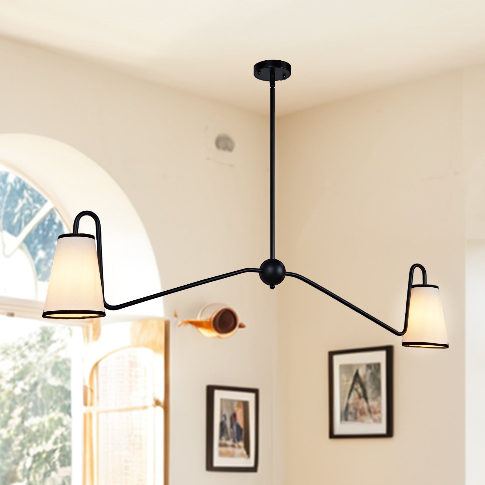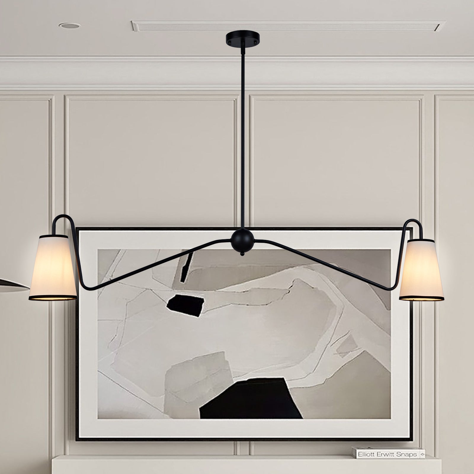 - In a minimal elegant design, our Jonas Linear Chandelier has subtly curved arms in two striking finishes. Its narrow linen shades complement the modern frame and illuminate your space with its sleek angled construction.