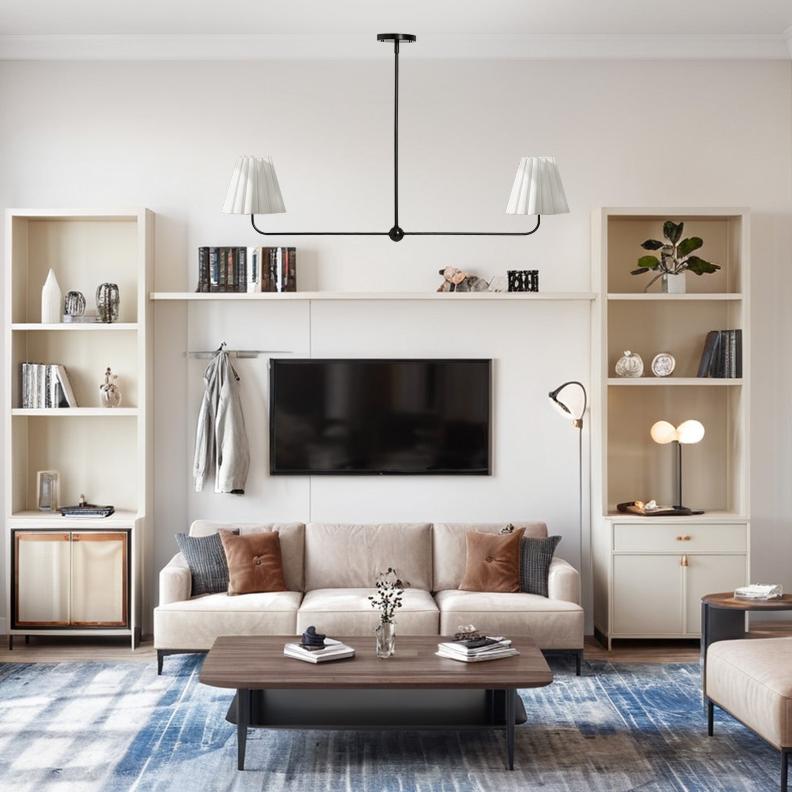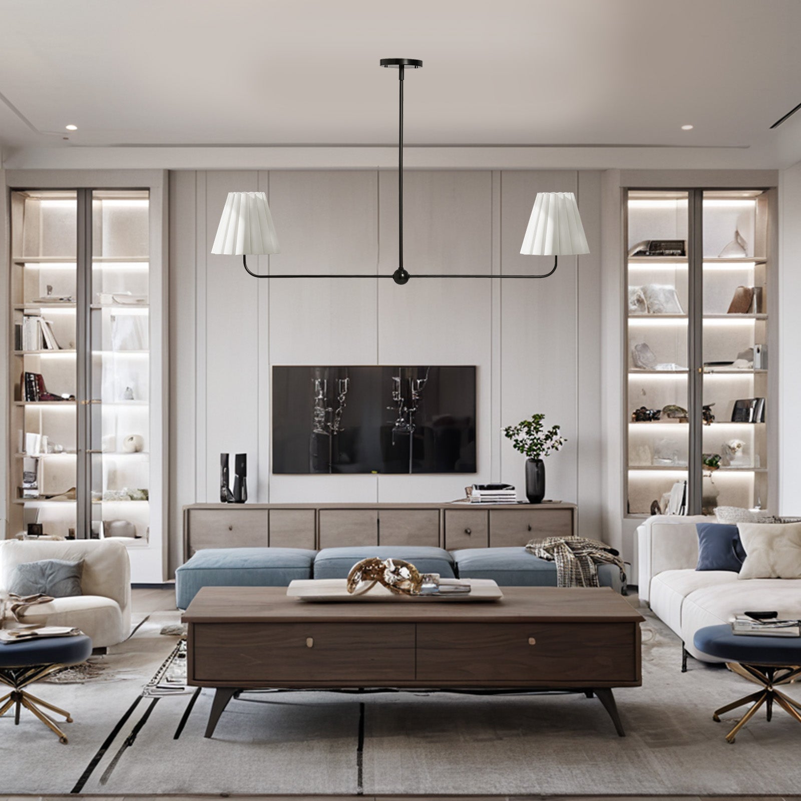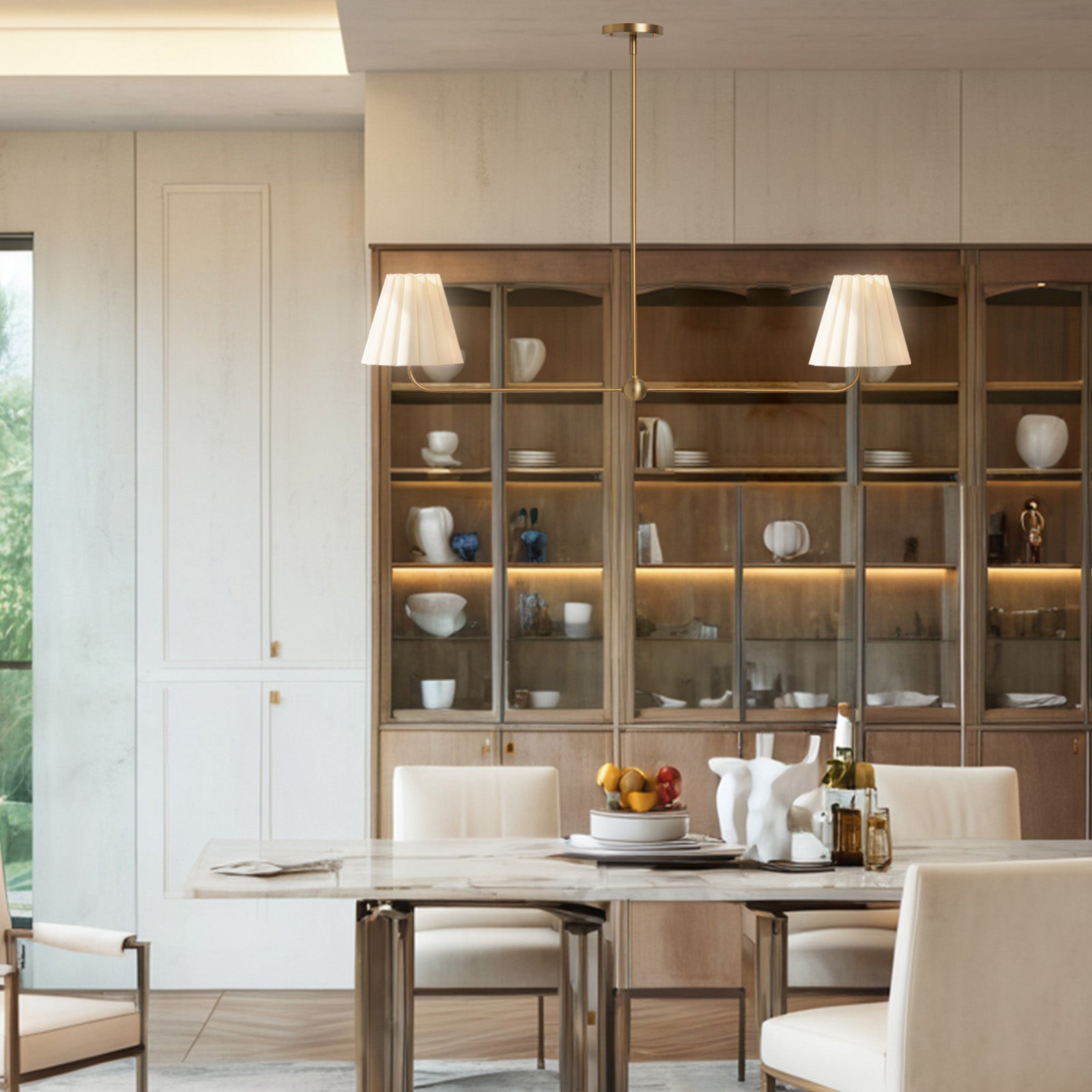 Kitchen Island Lighting with Pleated Linen Shade, 2 Lights Linear Chandelier with Adjustable Height (18-46"), Modern Ceiling Hanging Pendant Light for Dining Room, Living Room, Bedroom