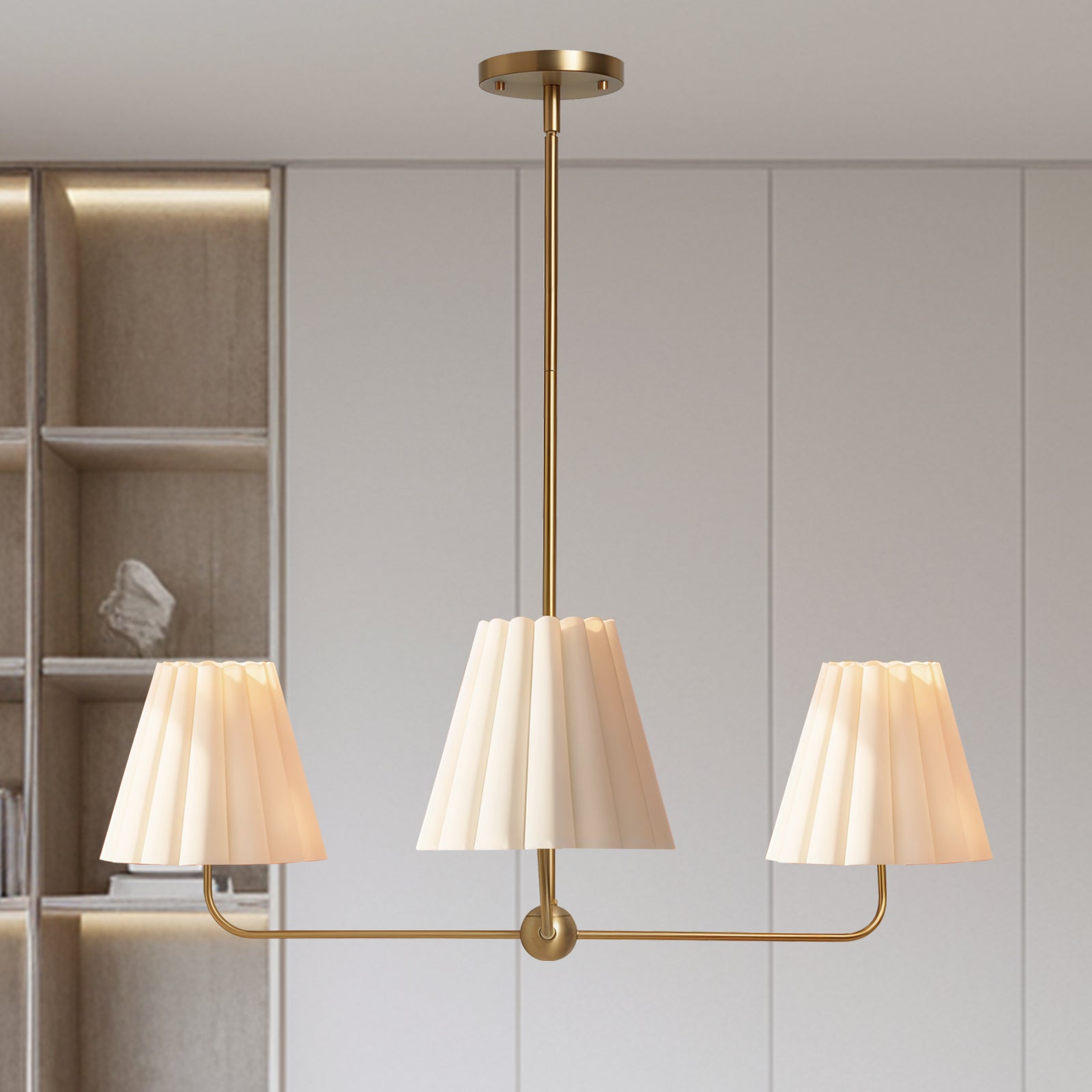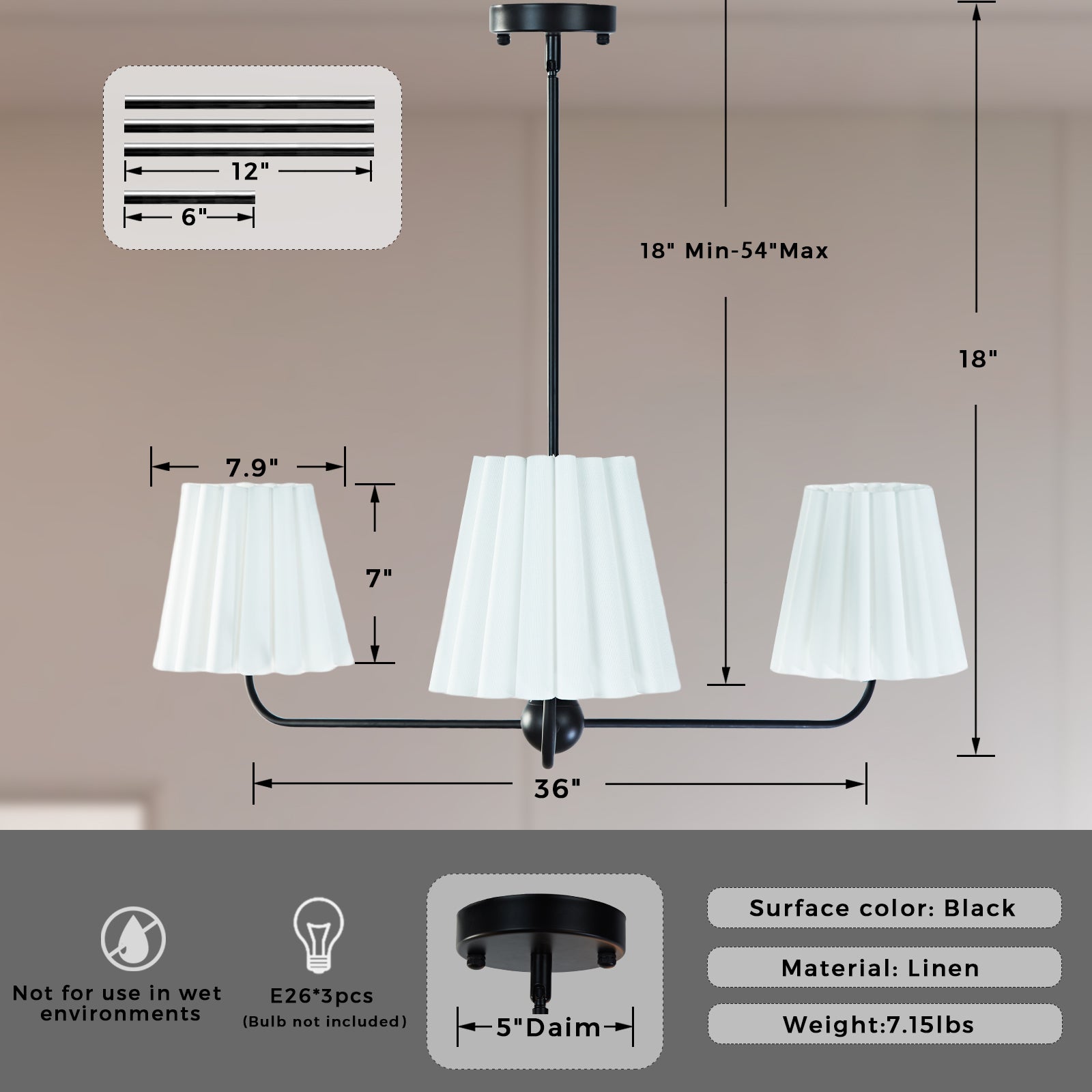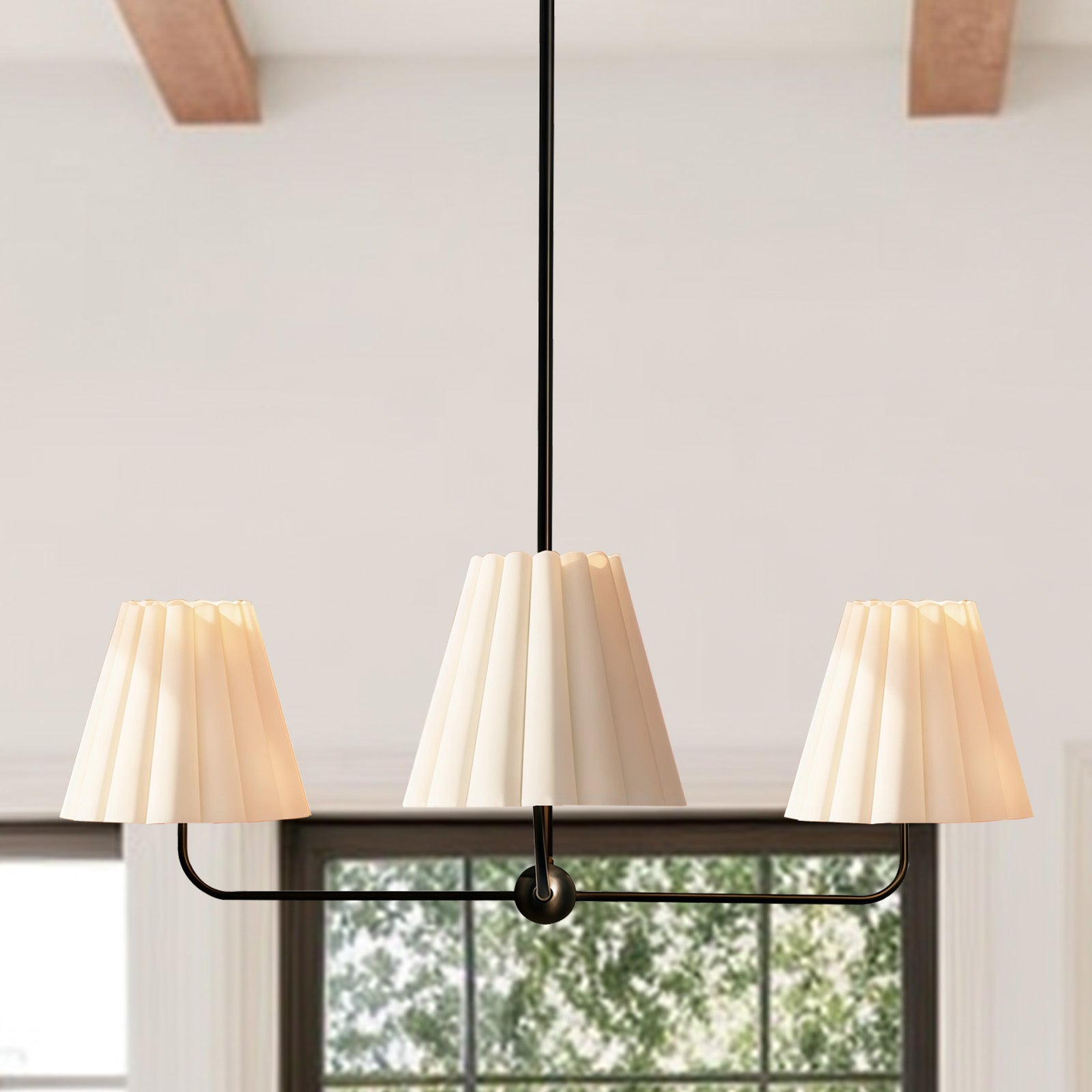 - Crafted with a steel frame and white linen shades, this chandelier is built to last. You can adjust the hanging height to suit your space and it comes with multiple metal rods for customization.
