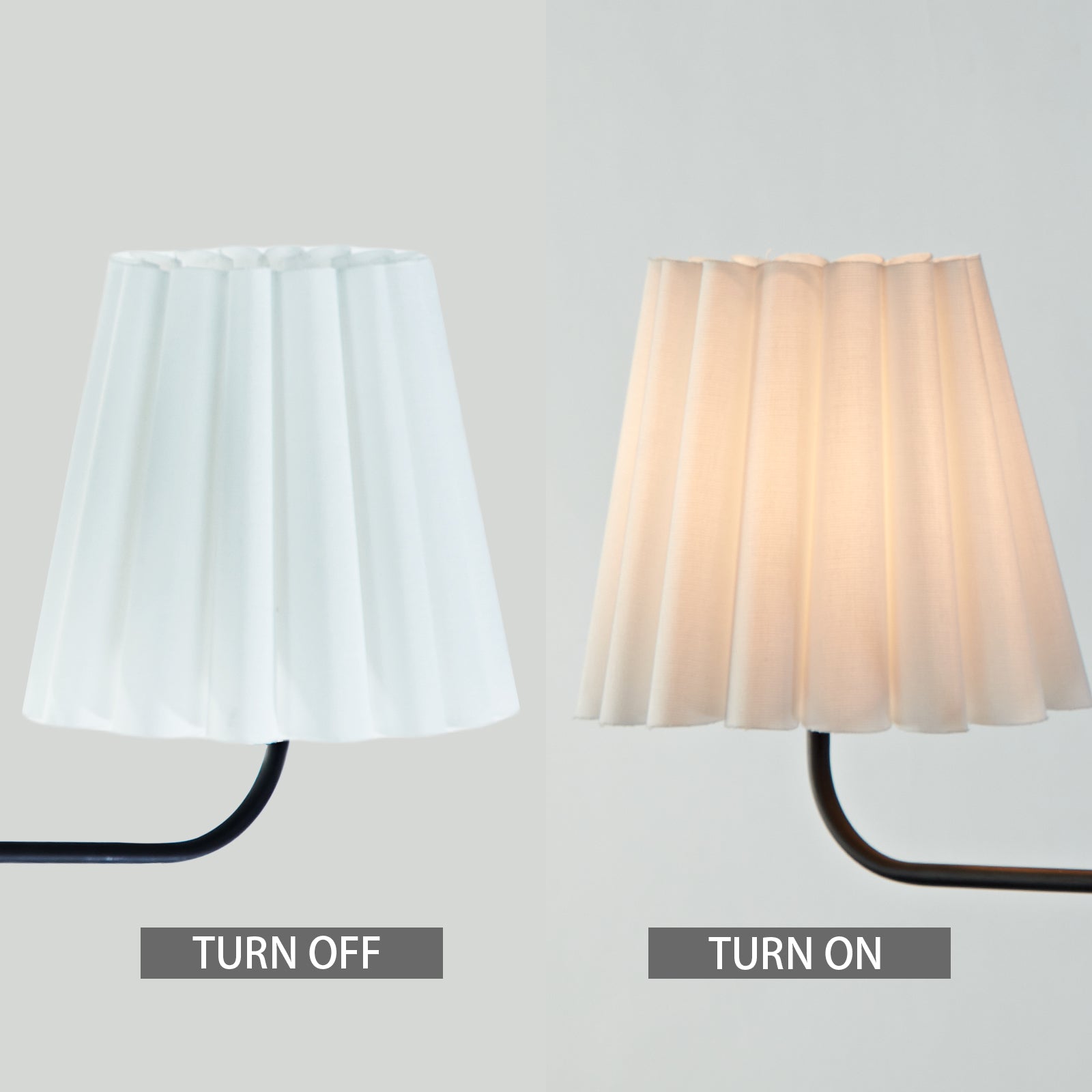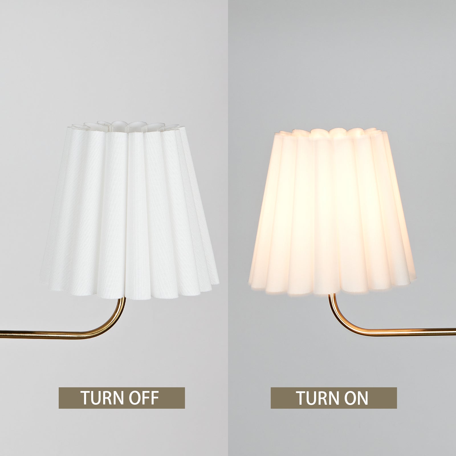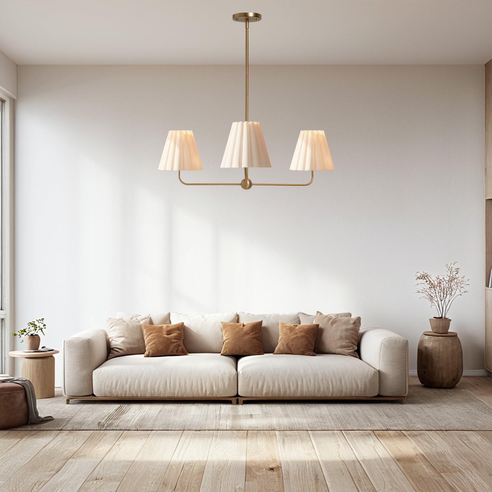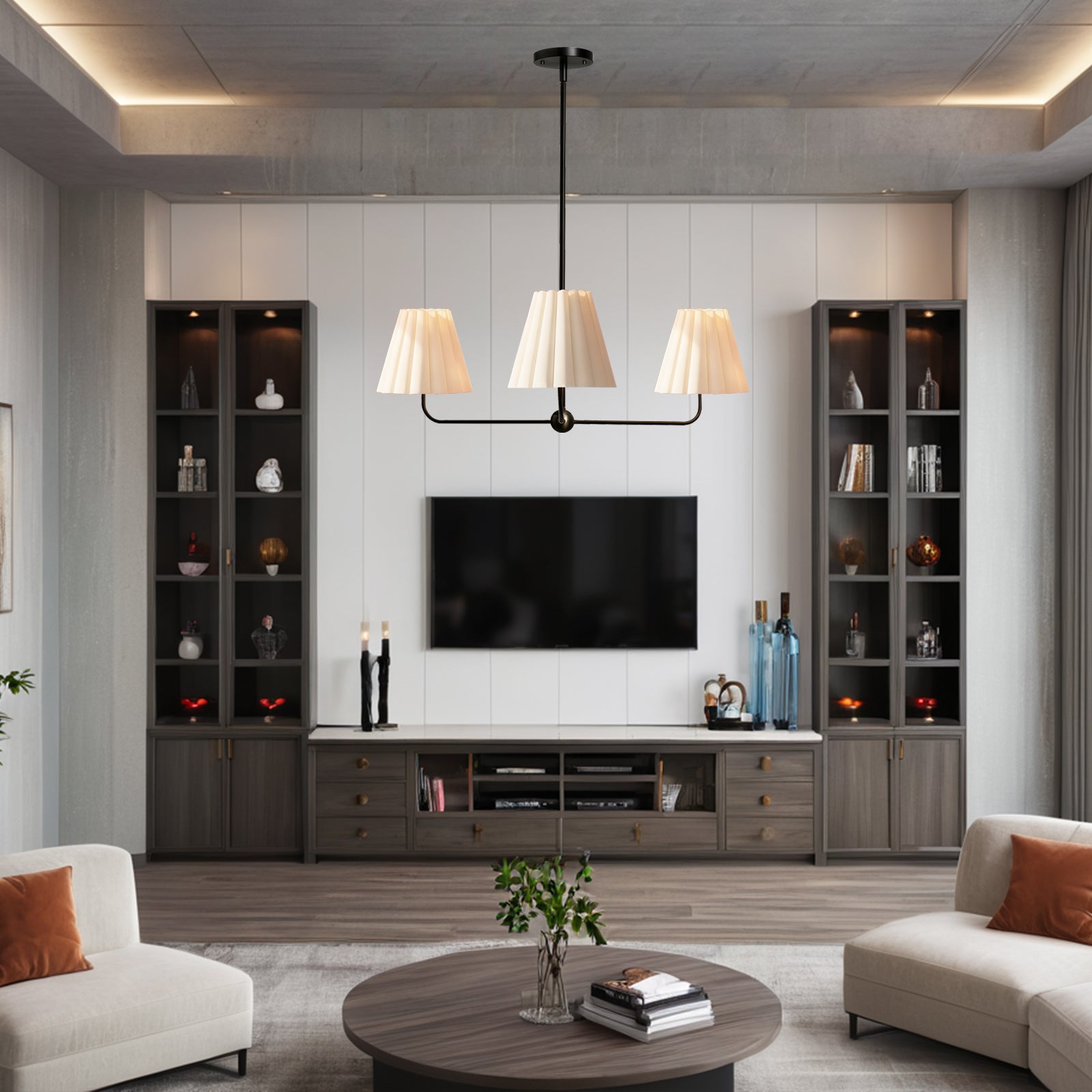 - Crafted with a steel frame and white linen shades, this chandelier is built to last. You can adjust the hanging height to suit your space and it comes with multiple metal rods for customization.