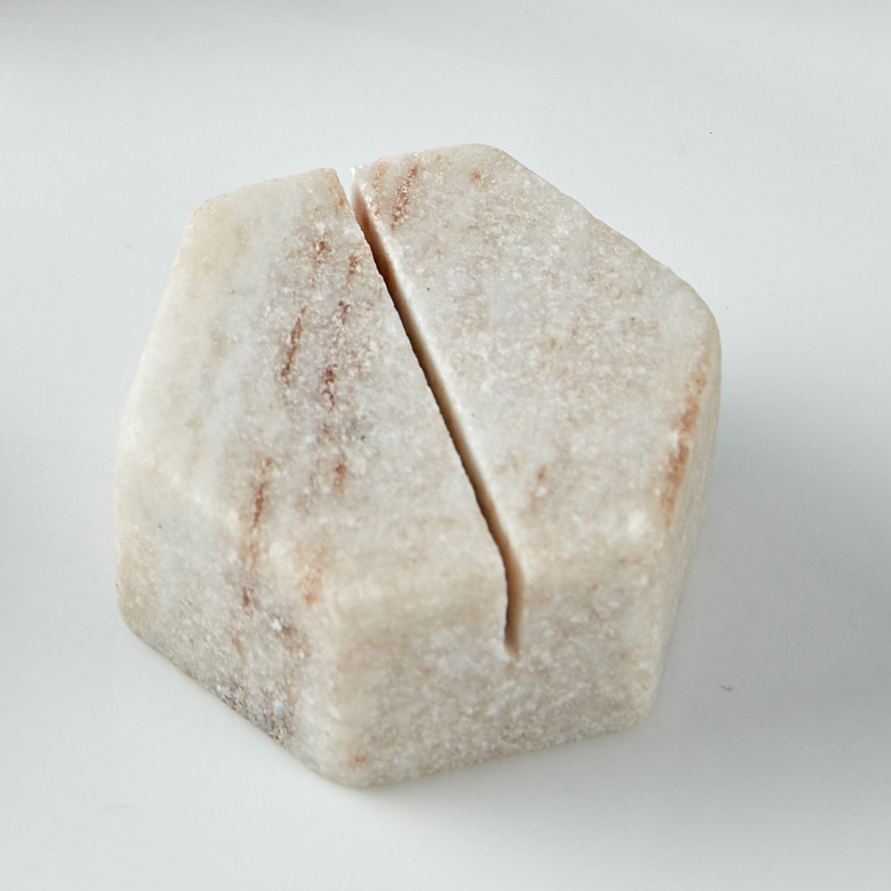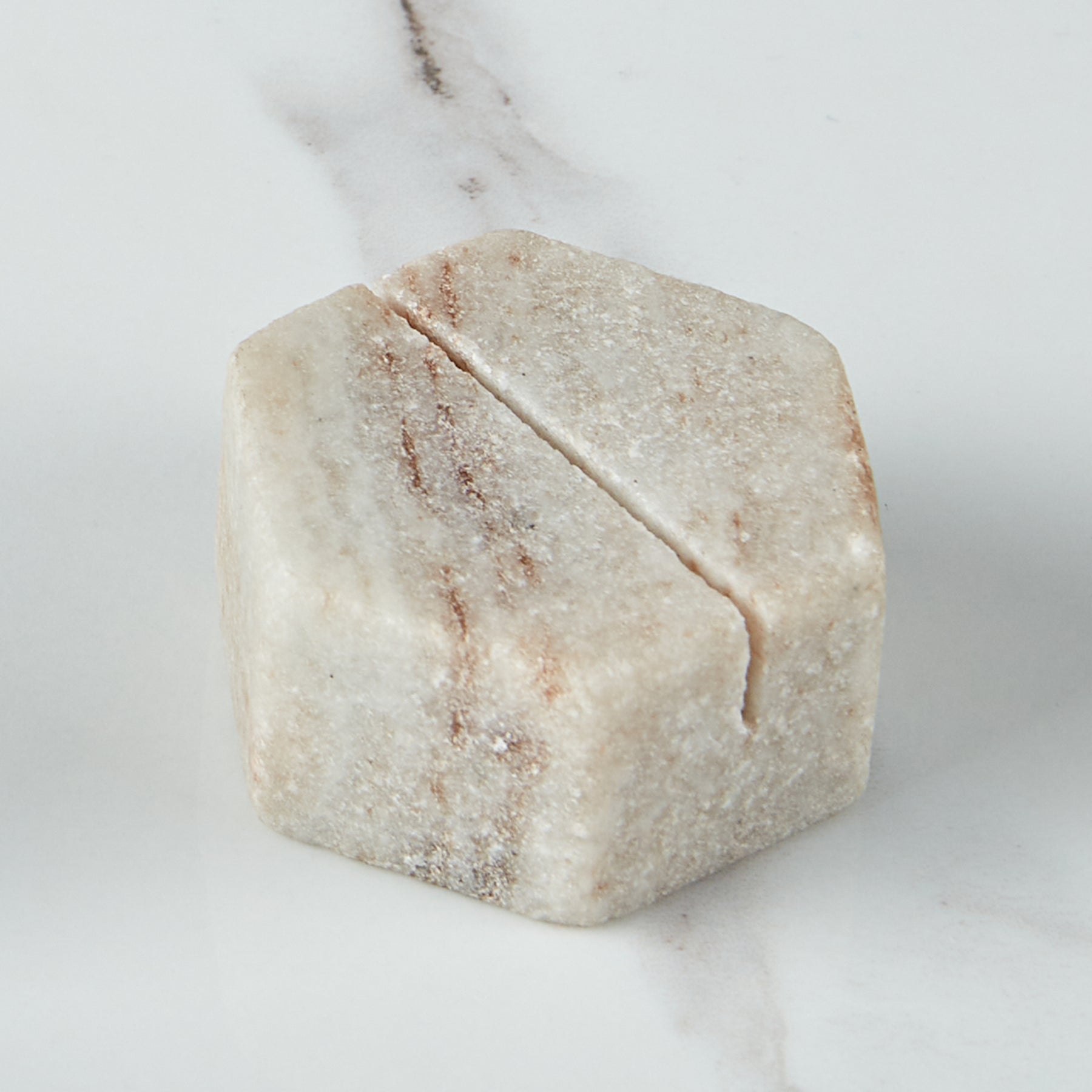 Hemispheres of pure marble serve as chic holders for personalized place cards. Slotted to hold a card indicating seating or identifying a dish on a buffet table or cheese spread, each holder in the set exhibits the natural earth tones and unique markings of marble.