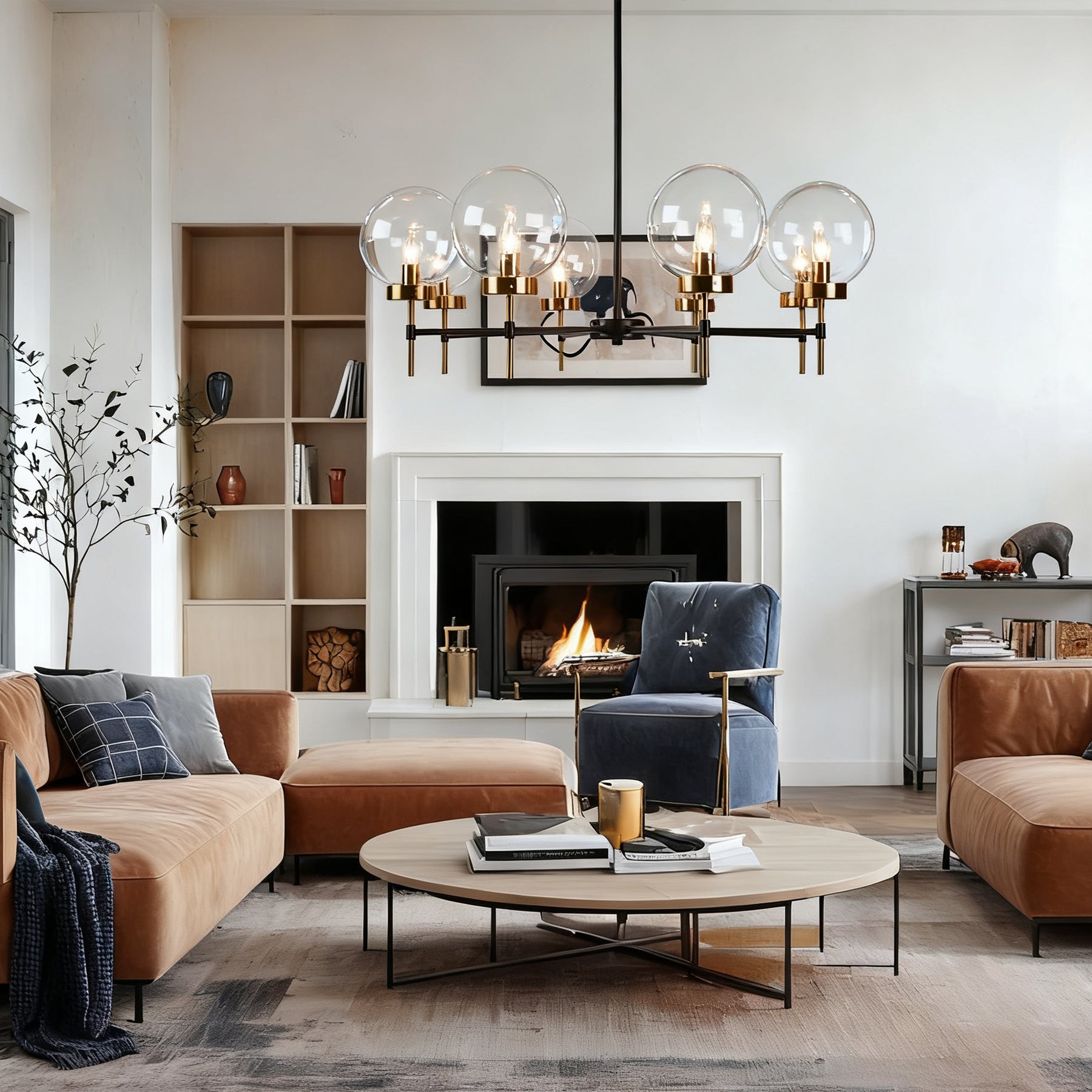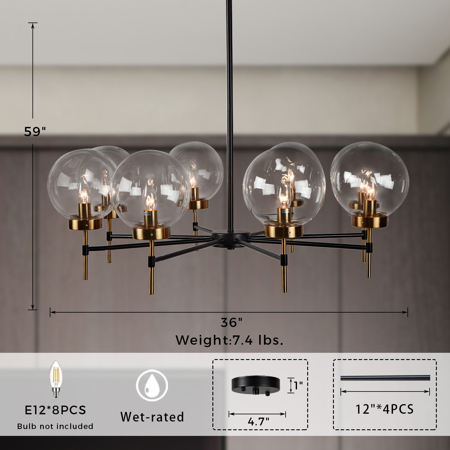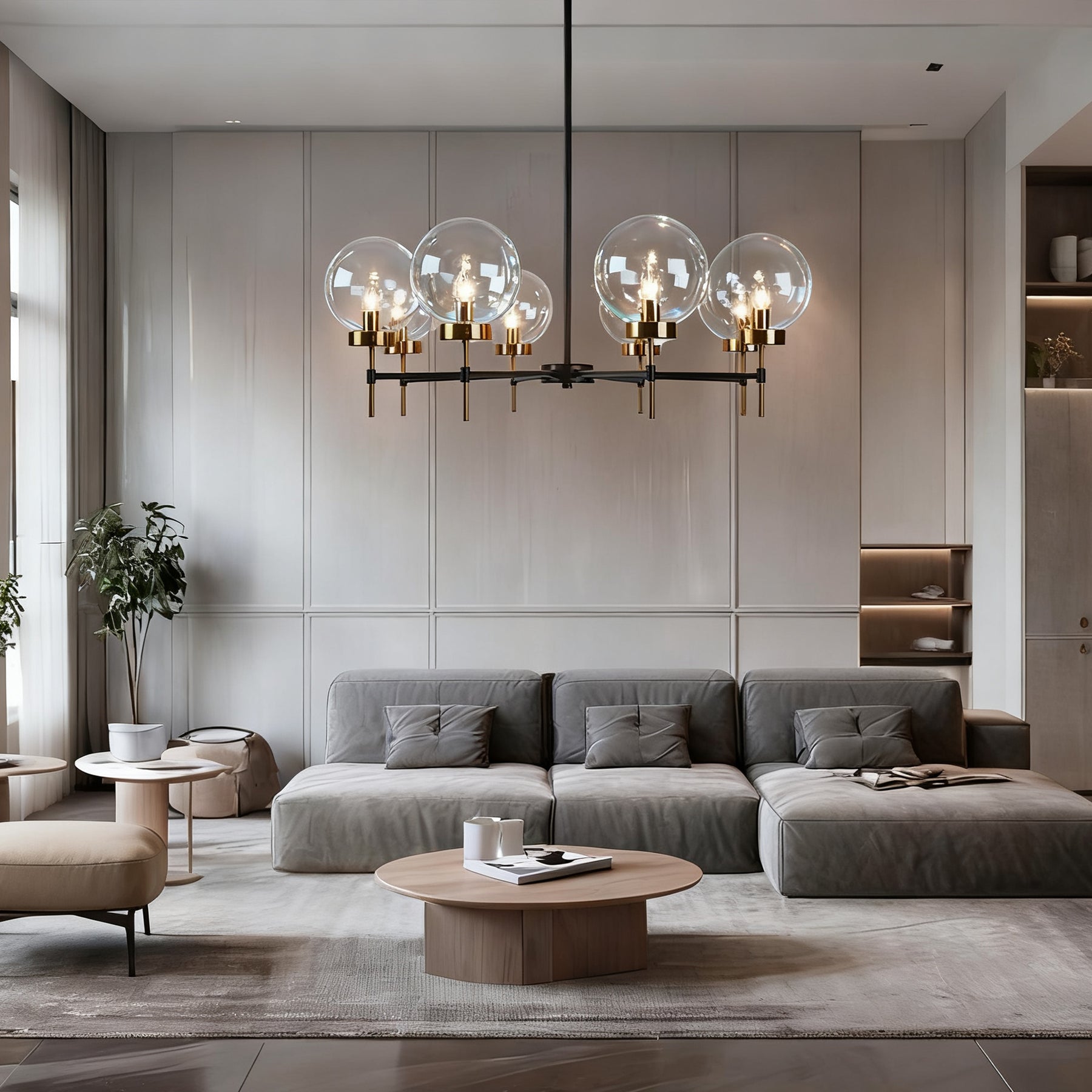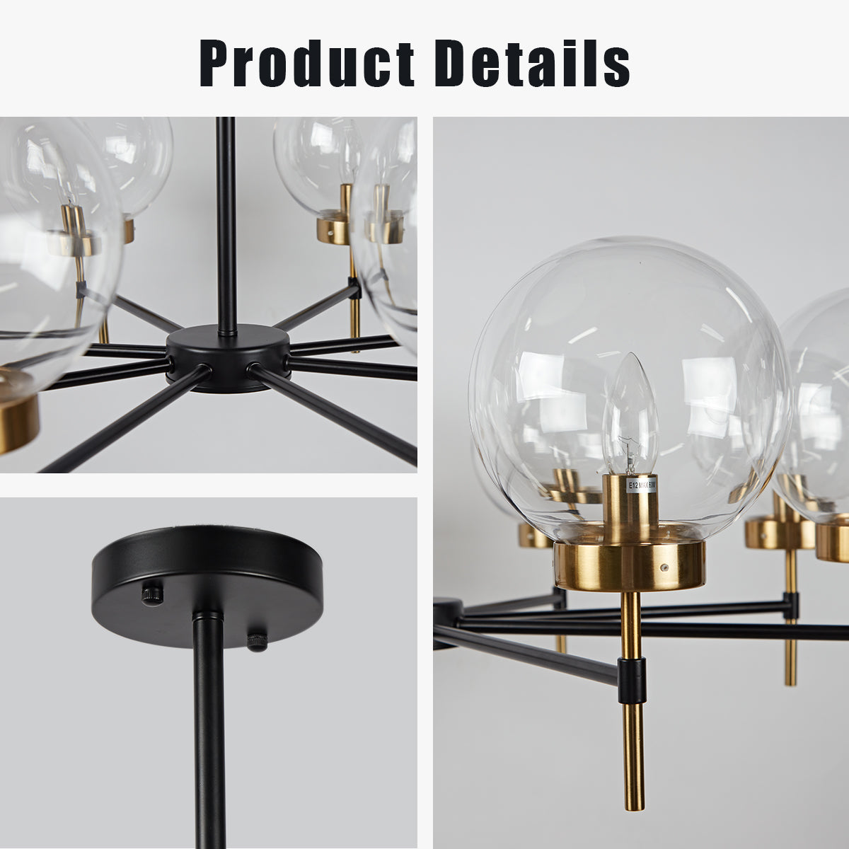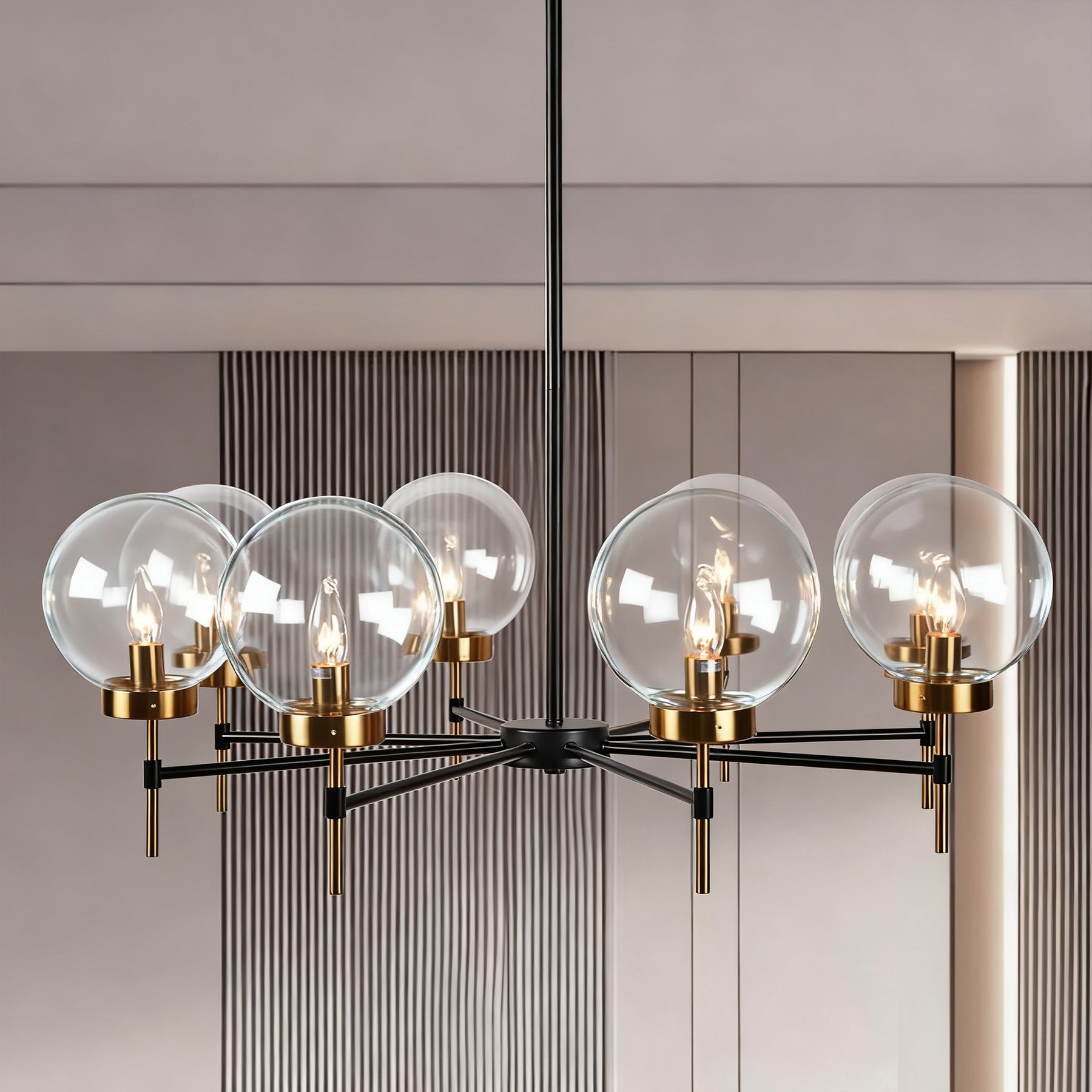 - The glass globe round chandelier features a brilliant display of two-toned metals and blown-glass orbs, creating a modern and sleek aesthetic inspired by mid-century form.
