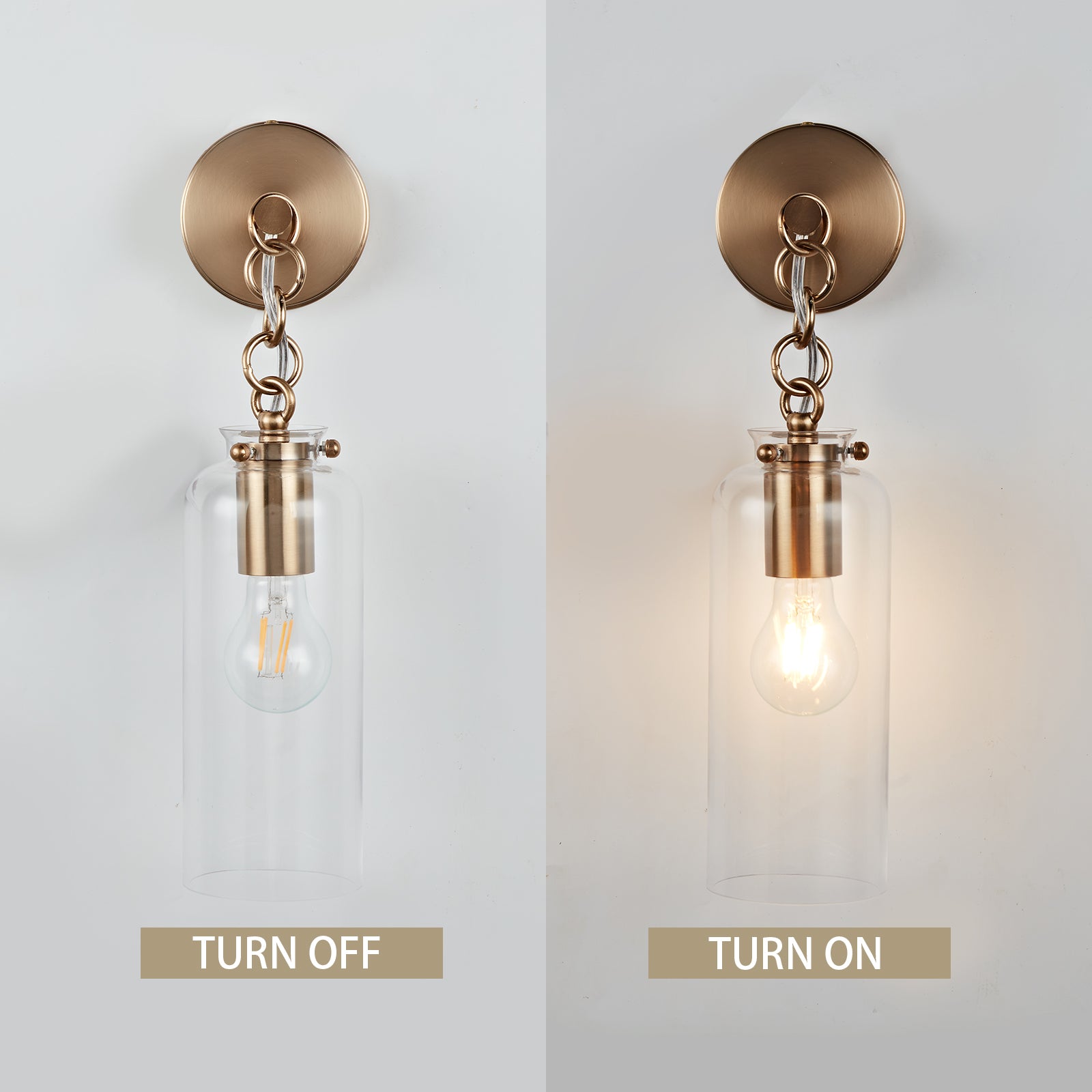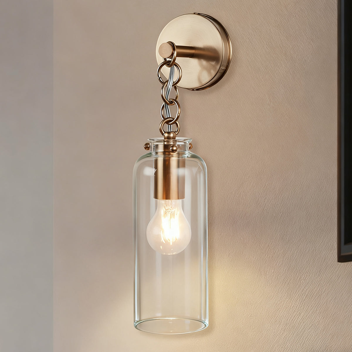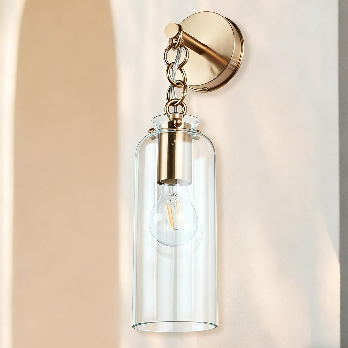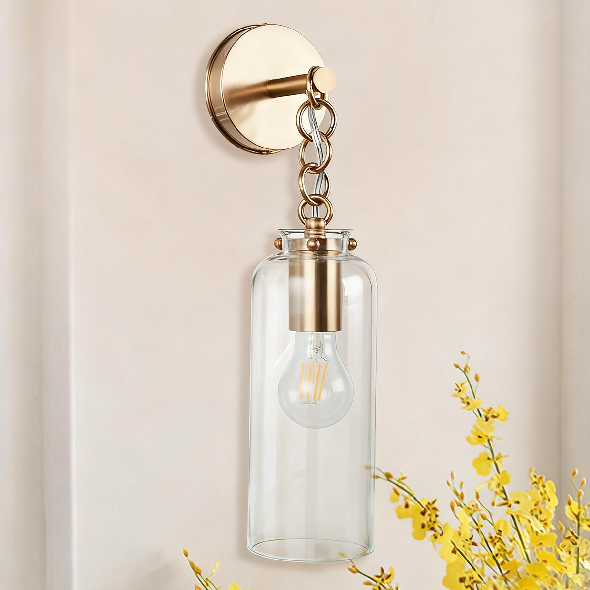 • blown glass with a Vintage Brass finish, this sconce features a stunning clear blown glass shade that casts a warm, inviting glow.