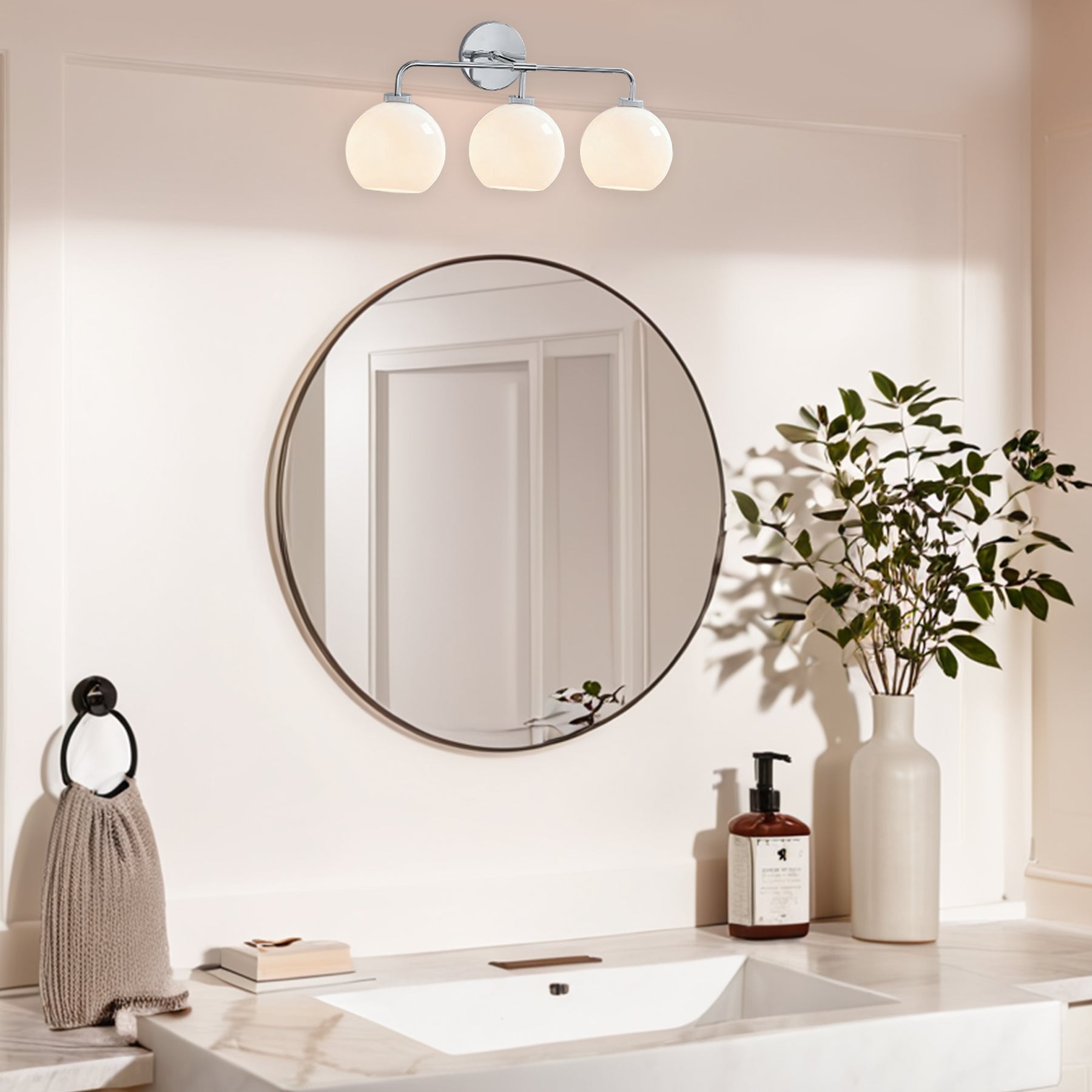 - Stylish Design: Crafted with a steel frame and blown glass, this 3-light vanity light is available in matte black, polished chrome, or brass finishes with clear glass or milk glass shades.