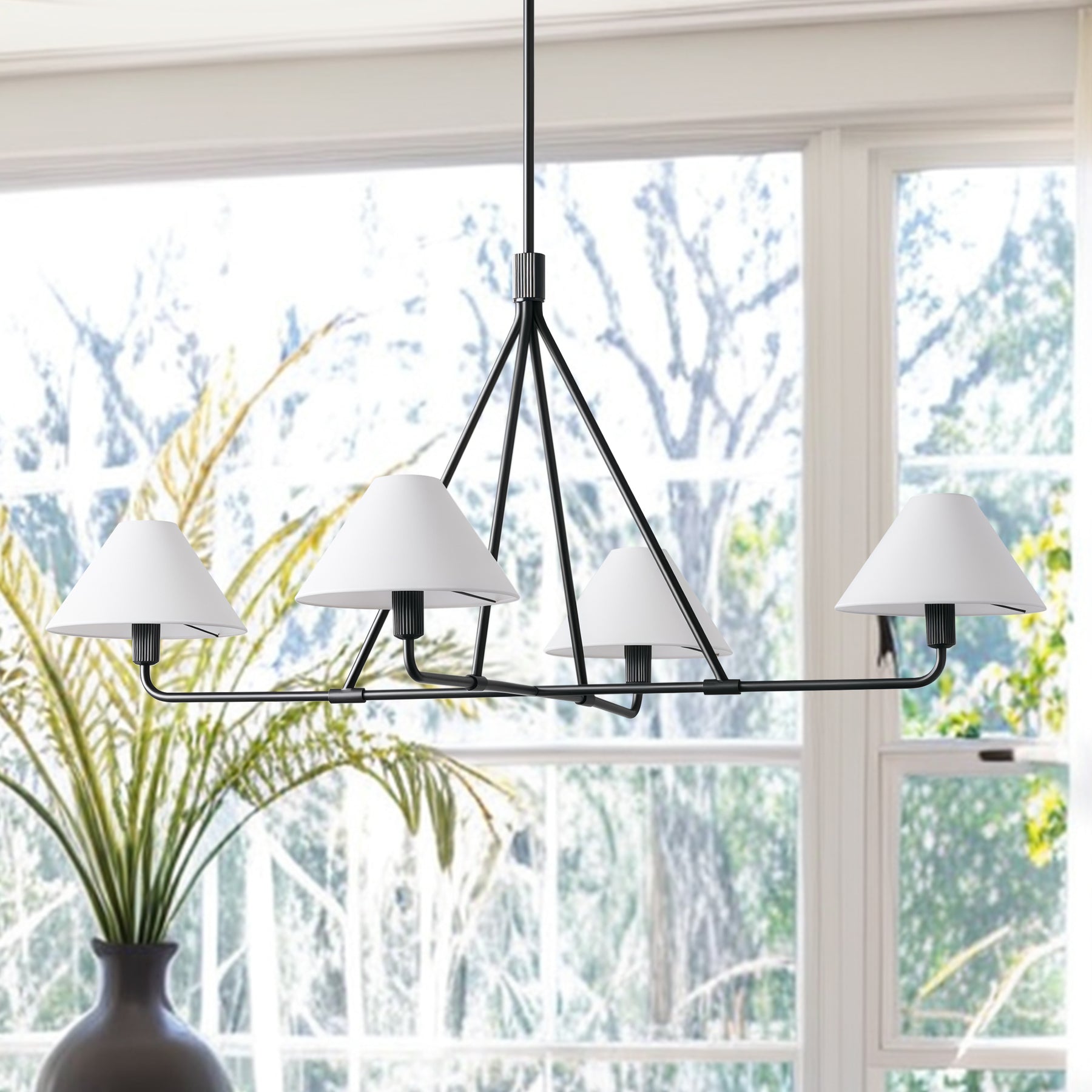 - Introducing our stunning Linen Chandelier, a versatile lighting fixture perfect for your dining room, bedroom, or living room. This chandelier features a modern and angular design with tapered linen shades that add a touch of sophistication to any space.