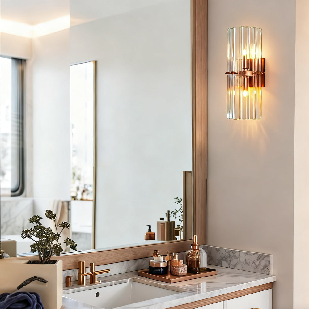 Antique Bronze Double Tube Sconce with Ribbed Glass Shades and Cylindrical Design for Durable Indoor Lighting